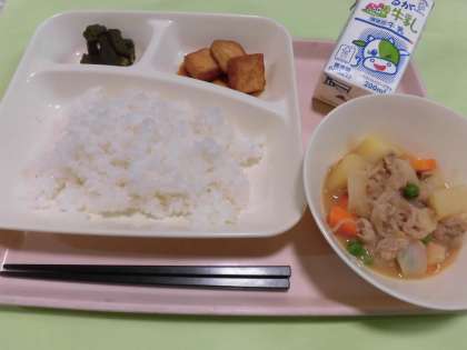 ・みそ肉じゃが ・あつあげのしょうがじょうゆかけ ・オクラのおかかいため ・ごはん ・牛乳  です。