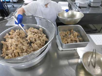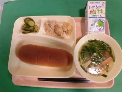 ・鶏肉のからあげ ・ハムととうがんの中華スープ ・きゅうりのピり辛あえ ・黒糖パン ・牛乳 です。