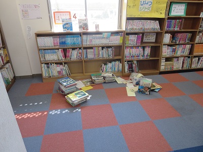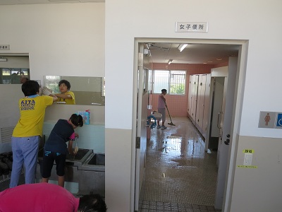 各階のトイレ清掃、図書館補助員の蔵書整理、プール清掃の様子です。