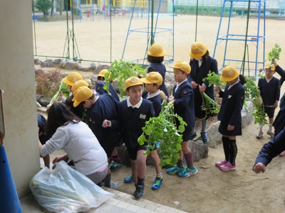 3年生は秋に植えた大阪伝統野菜の「田辺ダイコン」の収穫体験と食育「伝統野菜を味わおう」の学習をしました。