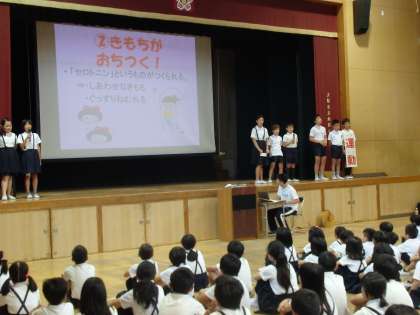 先週の児童集会で、健康委員会・給食委員会・運動委員会が発表をしました。12日(月)からの「元気モリモリ週間」に向けて、今年度の健康教育の目標と合言葉である「元気モリモリズムで1・2・3!」について呼びかけました。今回の集会では、運動委員会のみなさんが運動の大切さや楽しく体を動かすための遊び紹介をしました。