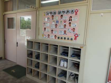 元気モリモリ週間の取り組みとして、全校児童に早寝・早起きについて呼びかけるため、健康委員会が標語を考え掲示物を作成しました。職員室前廊下に掲示しています。