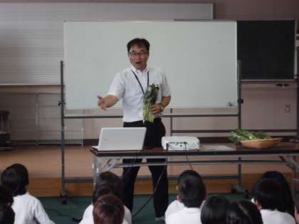 6月16日(金)JAの方に来ていただき「食料自給率」と「地産地消」についてお話をうかがいました。大阪府は食料自給率1%という数字にみんな驚いていました。最後にプレゼントとして小松菜と消しゴムをもらいました。(小松菜は平野区で取れたものだそうです。)