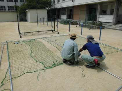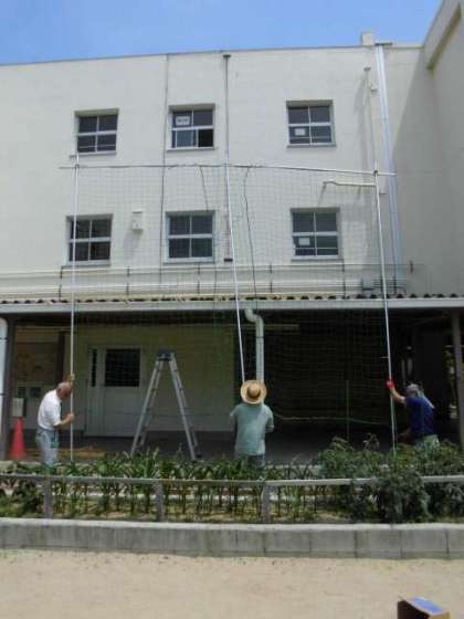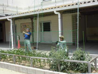壁面緑化事業として今年も給食室前にゴーヤを育てるための枠組みを作りました。組み立ては管理作業員さんを中心に行いました。教頭先生もお手伝いをしています。