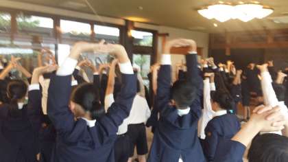 お早うございます。朝、少しパラパラと雨が降っていたので室内で朝の会を行いました。今は止んでいます。朝食を食べて今から閉舎式、そしてスペイン村に向かいます。