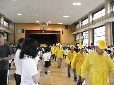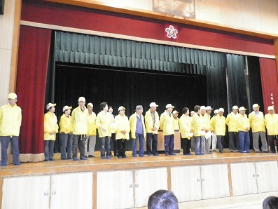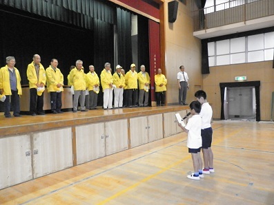 今日の児童朝会で、見まもり隊の皆さんとの対面式を行いました。