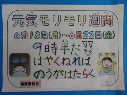 来週からの「元気モリモリ週間」に向けて、けんこう調べの時間に早寝・早起きを毎日できるように呼びかけをしました。早寝・早起きに関する標語を考え、掲示物も作成しました。
