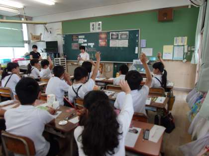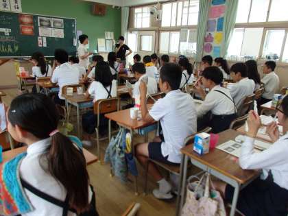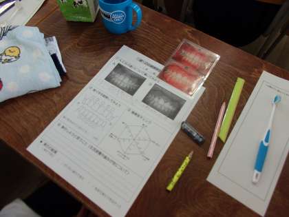 大阪市教育委員会の歯科保健事業である「歯・口の健康教室」を実施しました。歯科衛生士さんから、生活習慣病の一つである「むし歯」と「歯周病」についてお話をして頂き、普段の自分の生活をワークシートを使って振り返りました。最後にプラークテスターを使って、普段の歯みがきが丁寧にできているかチェックしました。