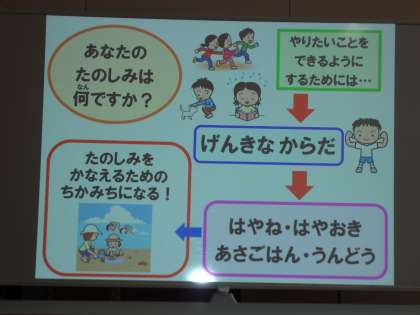 6月の体重測定の際に全学年に保健指導をしました。自分の夢や希望、楽しみを実現するために「早寝・早起き・朝ごはん・運動」を毎日実践することが大切であることを学びました。出来ることから取り組むことで、規則正しい生活習慣が身に付くことが分かったと思います。昨年度は、早寝の習慣が身についていない児童が多数みられたため、お家の方でも改善できるよう、生活リズムを見直していただけたらと思います。