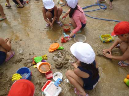 7月11日(水)2時間目、1年生はどろんこ遊びをしました。きたたつみの森の近くで家から持ってきたどろんこ遊びセットなどを使って川を作ったり、カレーや目玉焼きをどろで作ったり、とても楽しい時間を過ごすことができました。