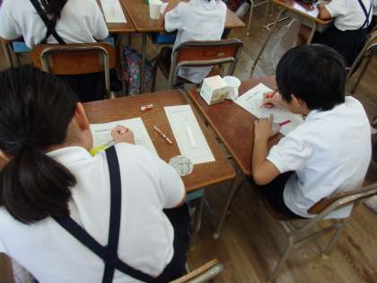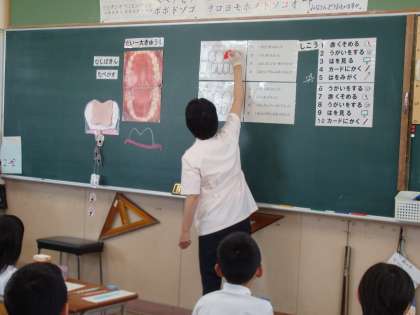 大阪市教育委員会から歯科衛生士さんに来ていただき、歯みがき指導を実施しました。歯垢染色液を使って、普段の自分の歯みがきの仕方を振り返り、正しい歯みがきの仕方を学びました。
