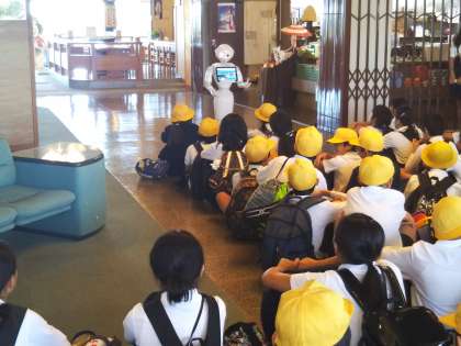 予定より30分早く宿舎に到着しました。女将さんとペッパーくんとで館内の説明をしてもらいました。このあと避難訓練、夕食となります。次回は夕食後、18時ごろ