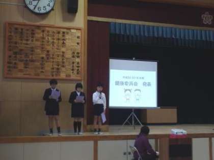 木曜日の児童集会で健康委員会の発表がありました。10月に行った睡眠に関するアンケートの結果の発表や睡眠レンジャーに扮して睡眠の大切さについて発表しました。
