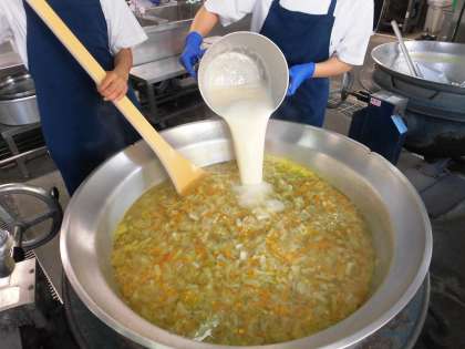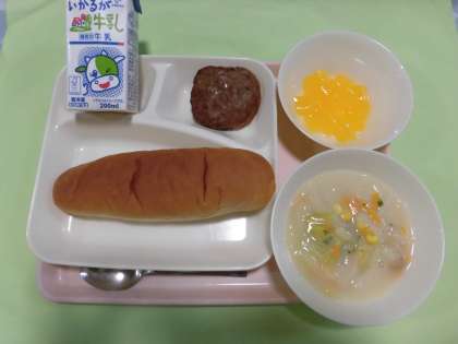 ・焼きハンバーグ ・豆乳スープ ・ダイスゼリー(みかん) ・黒糖パン ・牛乳 です。