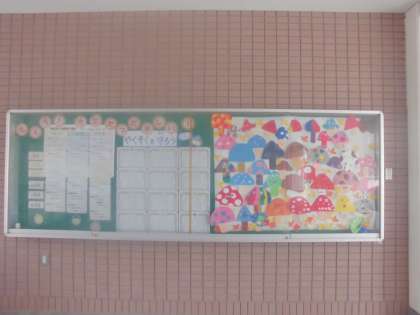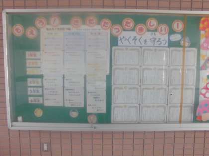 正門から玄関のピロティの掲示板の左半分を「PBSコーナー」としています。学校全体の行動目標だけでなく、各学年で考えた行動目標を掲示しています。ぜひご覧ください。