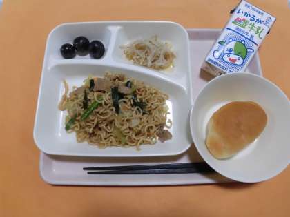 ・オイスターソース焼きそば ・もやしの中華あえ ・ぶどう(巨峰) ・ミニコッペパン ・牛乳 です。