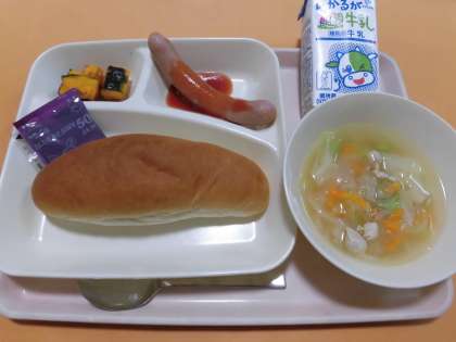 ・ウインナーのケチャップソース ・スープ ・焼きかぼちゃ ・コッペパン ・ブルーベリージャム ・牛乳 です。