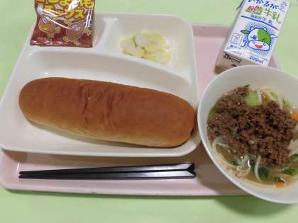 ・タンタンめん【肉みそ・汁めん】 ・キャベツの甘酢づけ ・おさつチップス ・黒糖パン ・牛乳  です。