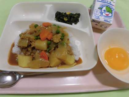 ・ポークカレーライス ・ほうれんそうのソテー ・黄桃(缶) ・牛乳 です。