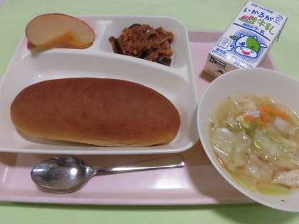 ・なすのミートグラタン ・鶏肉とキャベツのスープ ・りんご ・黒糖パン ・牛乳 です。