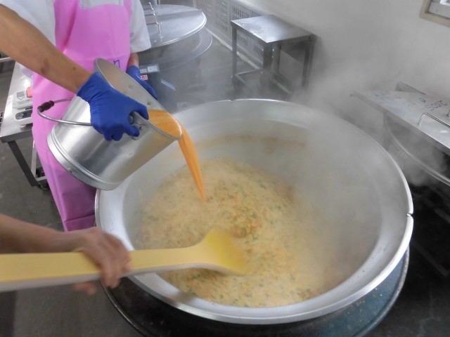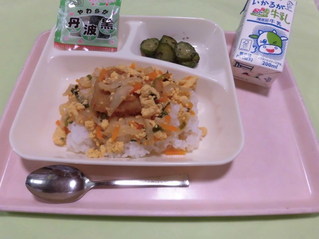 ・カツ丼 ・きゅうりの赤じそあえ ・ソフト黒豆 ・牛乳 です。