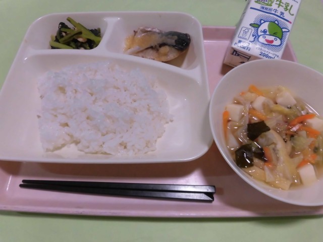 ・さばのおろしじょうゆかけ ・五目汁 ・こまつなの煮びたし ・ごはん ・牛乳 です。
