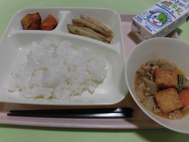 ・きびなごてんぷら ・豚肉とあつあげの煮もの ・焼きかぼちゃの甘みつかけ ・ごはん ・牛乳 です。