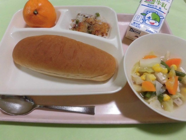 ・きのこのドリア ・鶏肉と野菜のスープ煮 ・みかん ・黒糖パン ・牛乳 です。