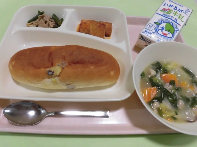 ・はくさいのとろみ煮 ・あつあげのピり辛じょうゆかけ ・豚肉とさんどまめのオイスターソースいため ・おさつパン ・牛乳 です。