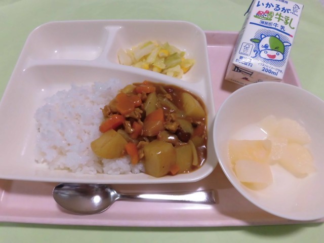 ・豚肉と金時豆のカレーライス ・サワーソテー ・和なし(カット缶) ・牛乳 です。