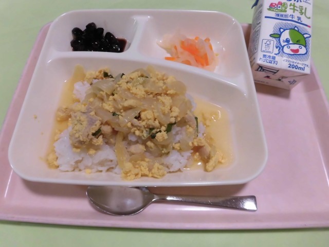 ・親子丼[除去食(卵)] ・紅白なます ・黒豆の煮もの ・牛乳 です。