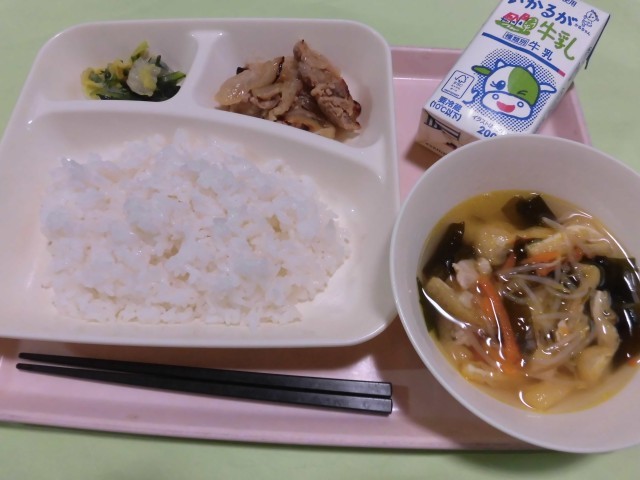 ・豚肉のスタミナ焼き ・五目汁 ・きくなとはくさいのおひたし ・ごはん ・牛乳  です。