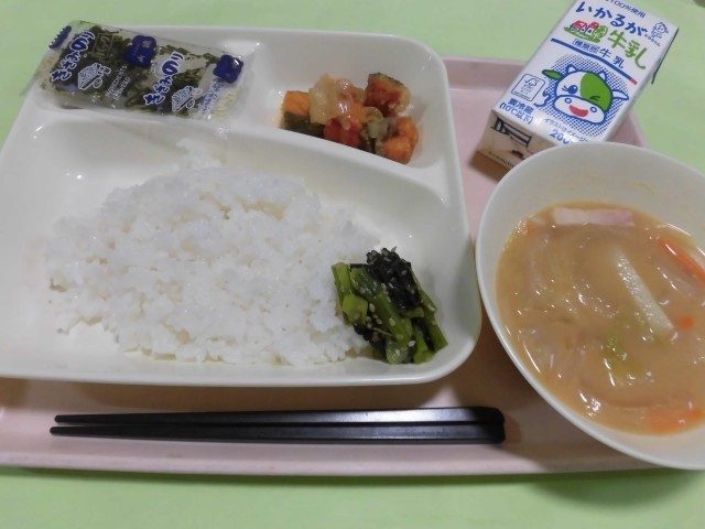 ・こまつなっ葉めし【きざみのり】 ・さけの和風マリネソースかけ ・じゃがいもとベーコンのみそ汁 ・ごはん ・牛乳 です。