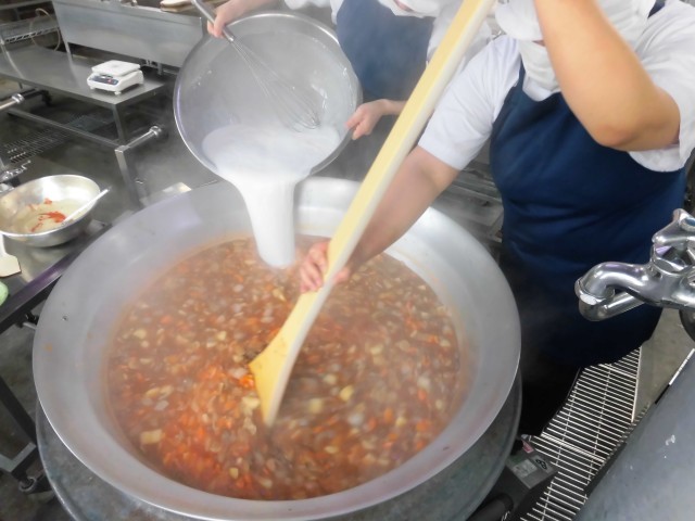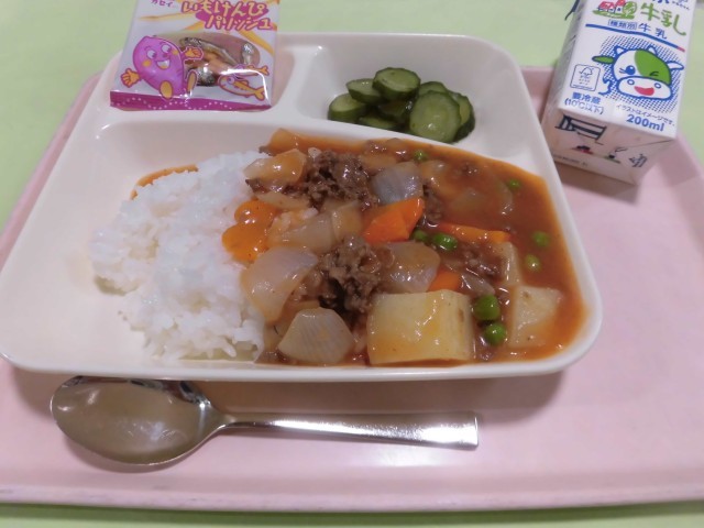 ・ハヤシライス ・きゅうりのバジル風味サラダ ・いもけんぴフィッシュ ・牛乳  です。