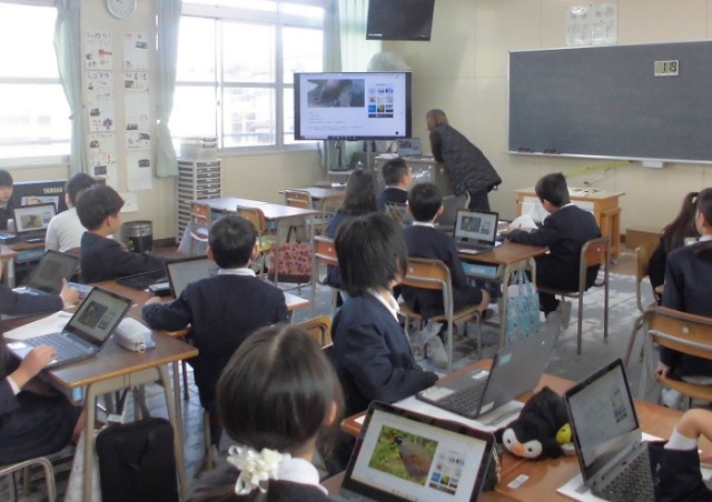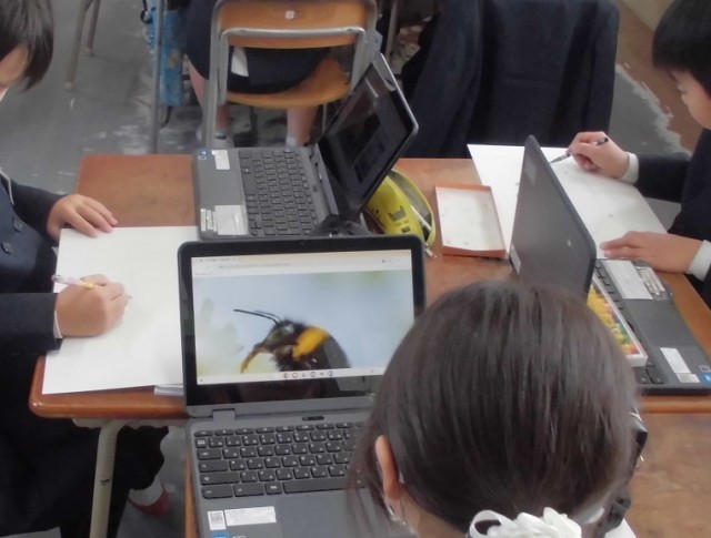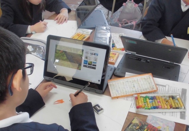 タブレットで、二次元コードを読み取り、説滅危惧種のホームページを出し、それぞれ気になる生き物を選んでポスターを作りました。