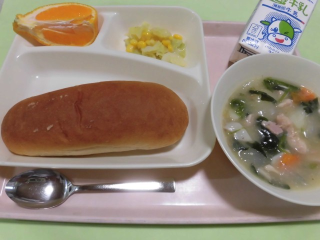 ・鶏肉とほうれんそうのシチュー ・キャベツとコーンのサラダ ・デコポン ・黒糖パン ・牛乳  です。
