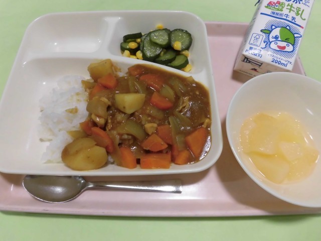 ・チキンレバーカレーライス ・きゅうりとコーンのサラダ ・洋なし(カット缶) ・牛乳 です。