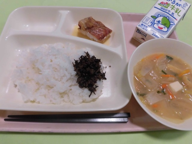・あかうおのレモンじょうゆかけ ・みそ汁 ・牛ひじきそぼろ ・ごはん ・牛乳 です。