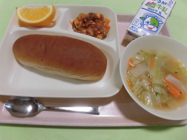 ・とうふのミートグラタン ・じゃがいもと野菜のスープ ・はっさく ・黒糖パン ・牛乳  です。