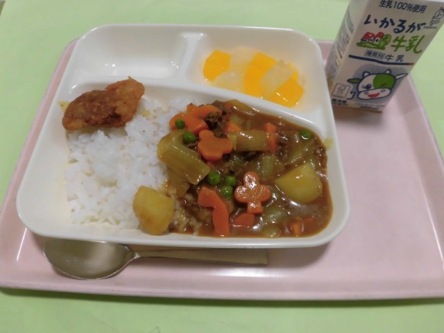 ・カツカレーライス〈米粉カツ・カレー〉 ・フルーツゼリー ・牛乳  です。