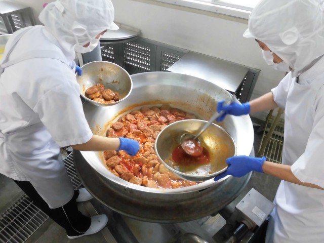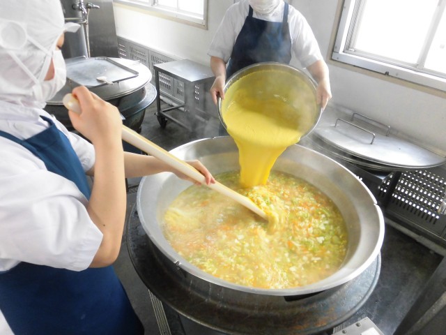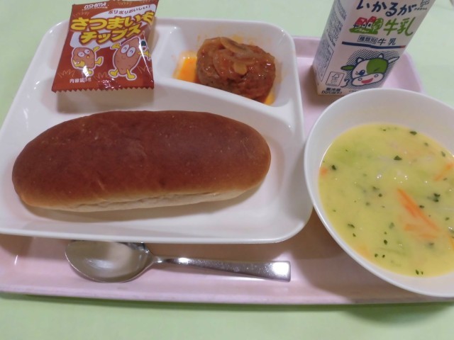 ・煮こみハンバーグ ・コーンスープ ・おさつチップス ・黒糖パン ・牛乳 です。