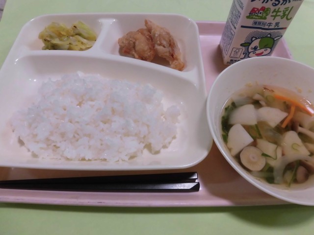 ・鶏肉のたつたあげ ・五目汁 ・キャベツの梅風味 ・ごはん ・牛乳 です。