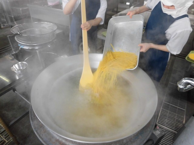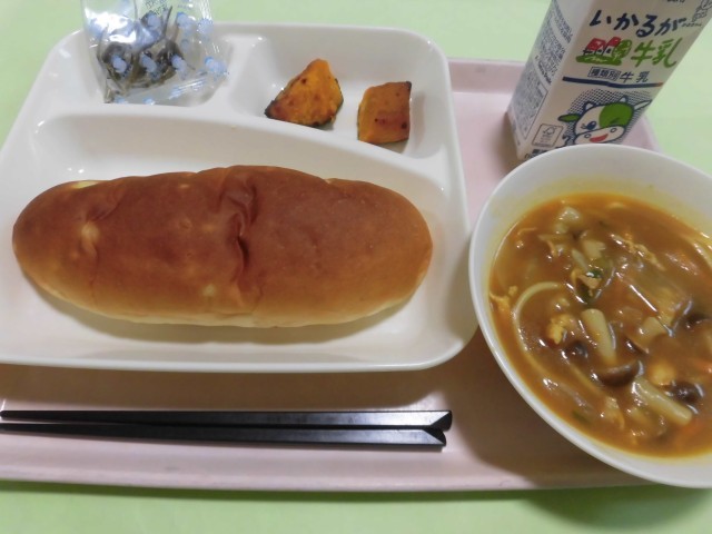 ・カレースープスパゲッティ(小麦) ・かぼちゃのマリネ焼き ・ミニフィッシュ ・おさつパン ・牛乳 です。