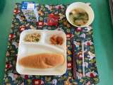 ヤンニョムチキン、とうふのスープ、切干しだいこんのナムル、コッペパン、いちごジャム、牛乳
