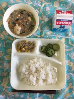 マーボーどうふ、きゅうりの甘酢づけ、もやしとピーマンのごまいため、ご飯、牛乳