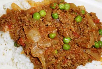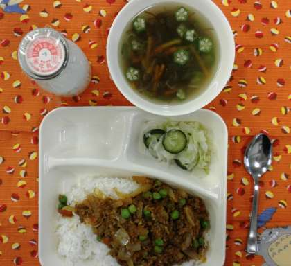献立コンクールの受賞メニューです。牛挽肉、豚挽肉をにんにくの風味で炒め、ケチャップ、ウスターソースで味付けしたものをご飯にかけて食べます。