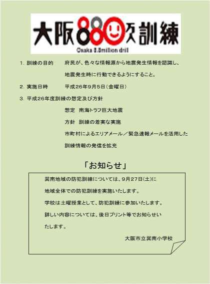 今日は「大阪880万人訓練」の日で、防災の緊急放送がありました。