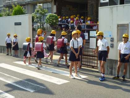 あいさつ週間最終日。今朝も強い日差しの中、代表委員の児童は正門前に立ち、大きな声で「おはようございます」