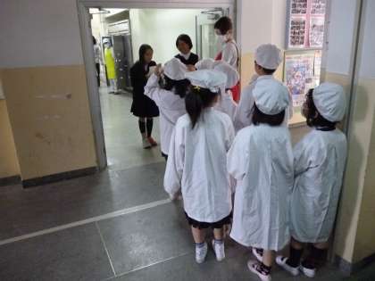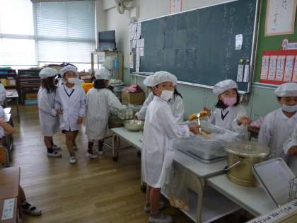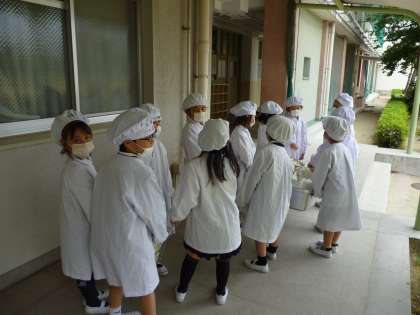 1年生、給食当番がんばっています