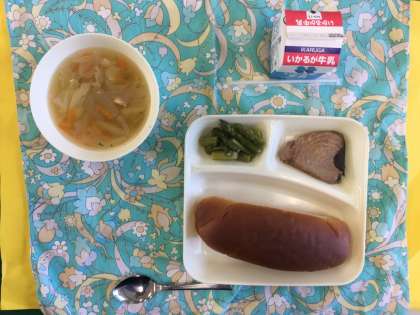 かつおのガーリックマヨネーズ焼き、鶏肉とじゃがいものスープ、グリーンアスパラガスのサラダ、こくとうパン、牛乳